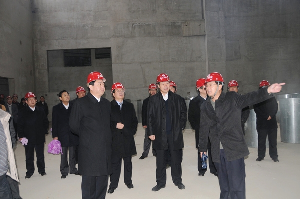 董事長徐鵬強(前排右一)向許立全書記(前排左一)等領(lǐng)導(dǎo)介紹工程建設(shè)情況